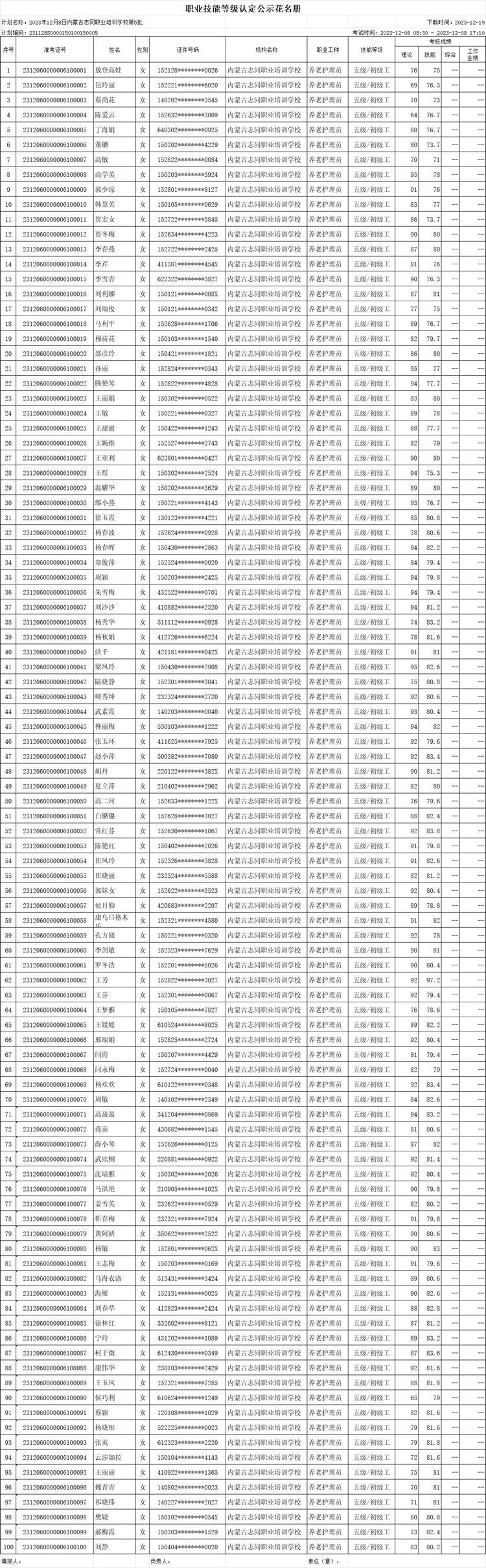 2023年12月8日内蒙古志同职业培训学校第5批职业技能等级认定名单公示